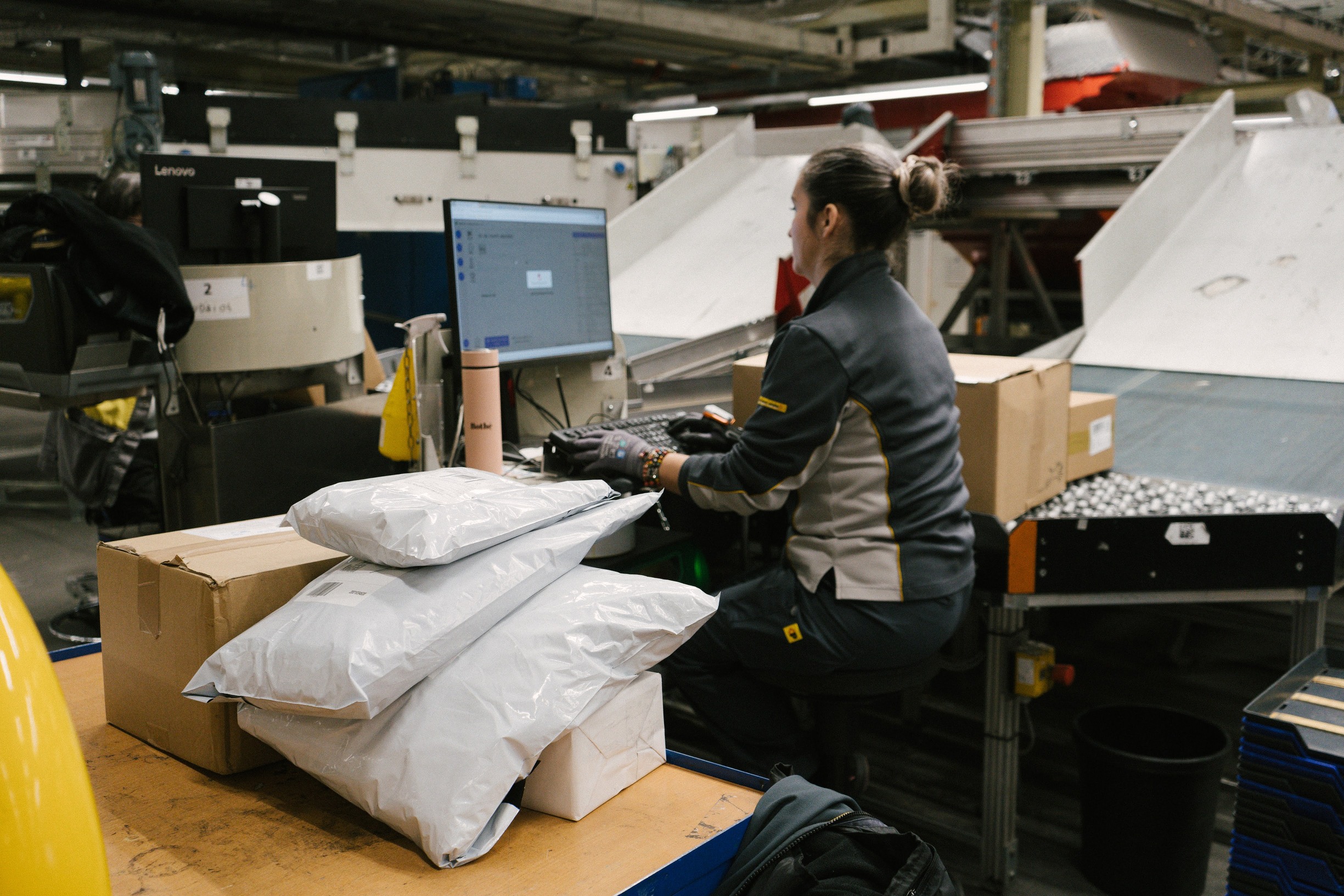 La collaboratrice Ana de Almeida à son poste de codage, au centre de colis de Daillens (VD). © Alisson Shepherd