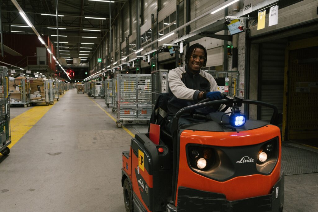 Bruno prêt à partir à la pause sur son chariot tracteur rouge, au centre de colis de Daillens (VD). © Alisson Shepherd