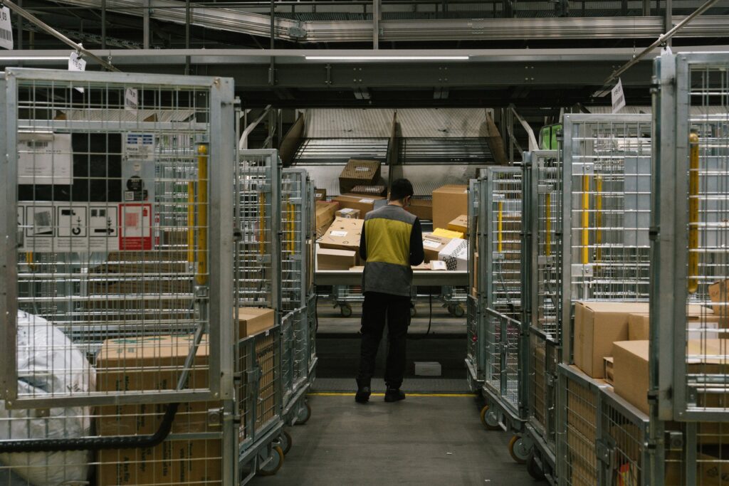 Un collaborateur de la poste devant de nombreux paquets qui transitent à Daillens. © Alisson Shepherd