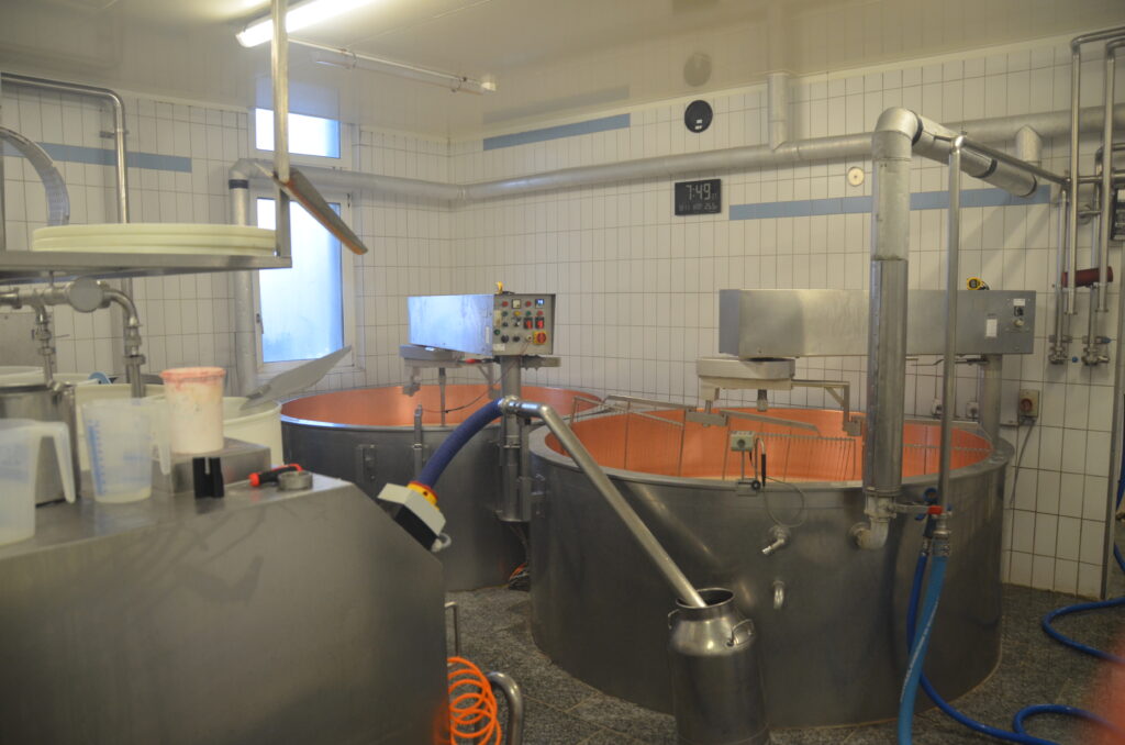 Tout commence dans une petite salle dans laquelle les producteurs livrent le lait du jour. Des tuyaux l’amènent jusque dans deux grandes cuves en cuivre, dans lesquelles on ajoute des ferments lactiques. Une fois le lait chauffé à 30°C arrive une des étapes les plus importantes: l’introduction de la présure, une enzyme présente dans l’estomac des veaux et qui va permettre au lait de cailler. C’est ici qu’entre en jeu tout le savoir-faire du fromager, qui doit déterminer le moment exact où arrêter la coagulation et ainsi éviter que la masse ne devienne trop compacte.