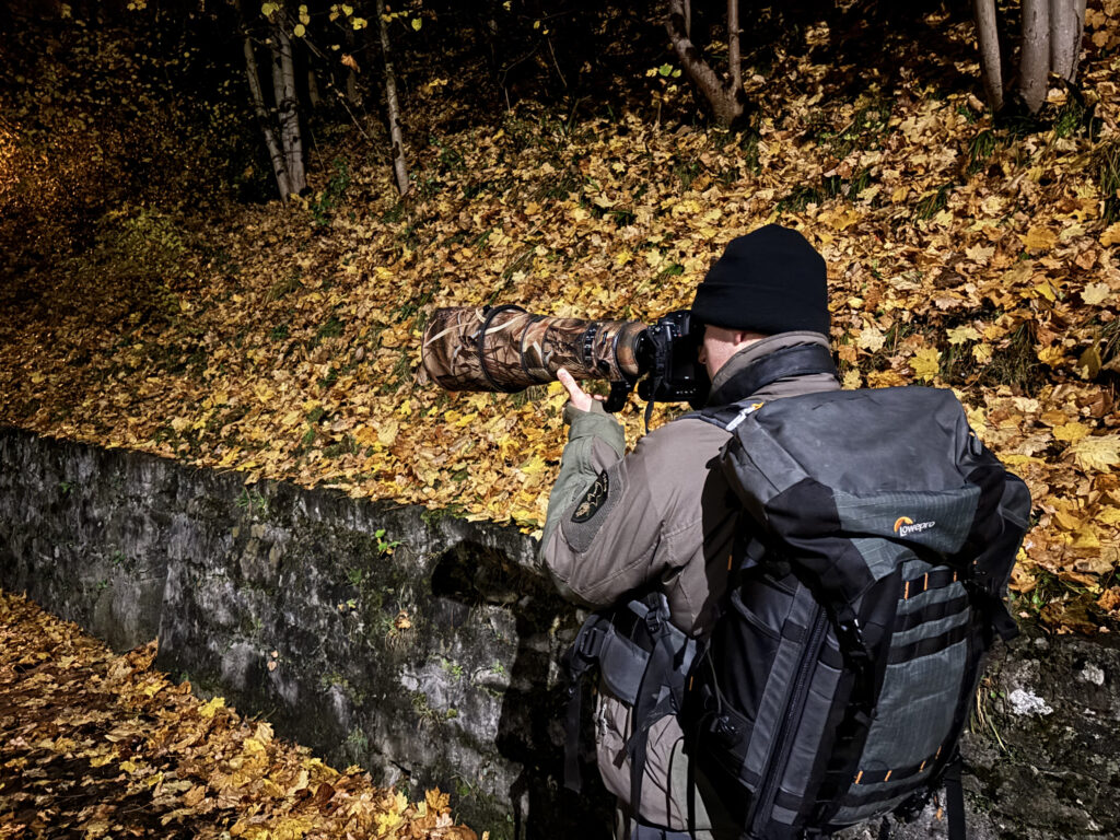 En affût, le temps semble s’égrener infiniment plus lentement. Le froid de la nuit de novembre commence à faire effet et les extrémités du corps se glacent progressivement. Après plusieurs changements de poste et de longues minutes de patience, il est presque deux heures du matin. « Dans 80% des sorties, je n’aperçois rien. Dans un sens, c’est stimulant. Tu ne sais jamais quand et si tu vas parvenir à rencontrer un animal. Il m’arrive parfois d’en rêver la nuit » plaisante le chasseur de clichés.